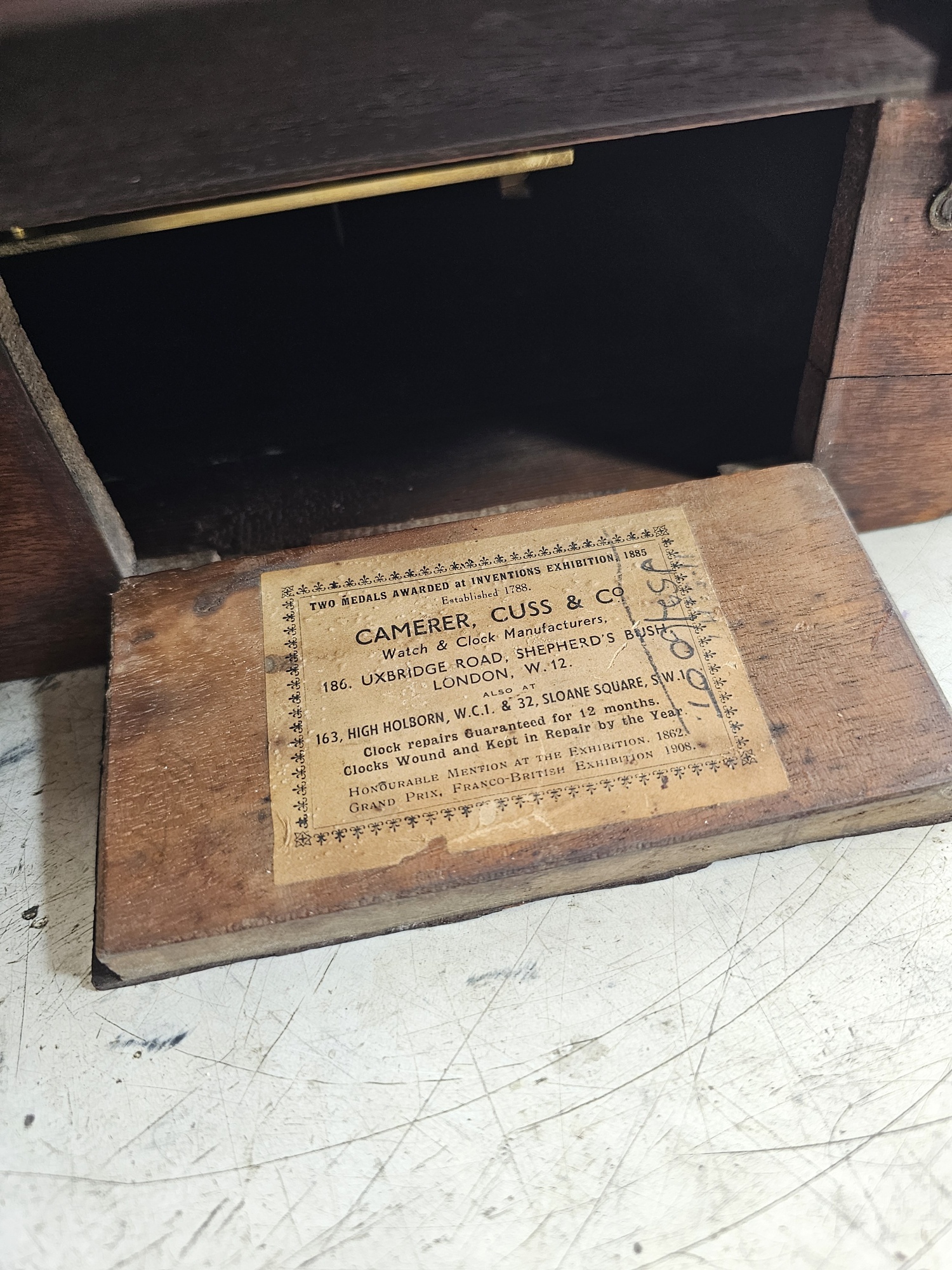 14" painted dial, original hands, signed Camerer Cuss & Co, 186 Uxbridge Road, London