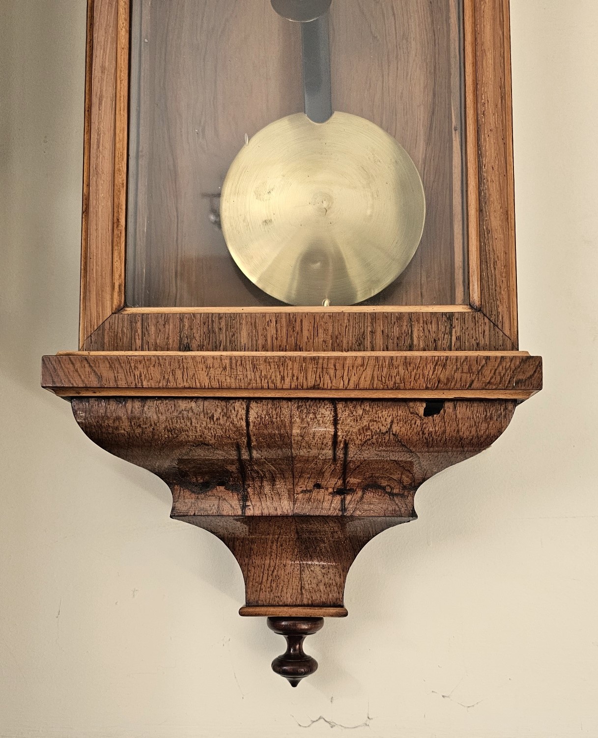 Brass pendulum bob swings to and fro inside glazed door with the original brass weight descending in front